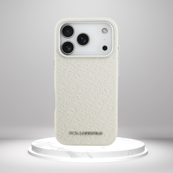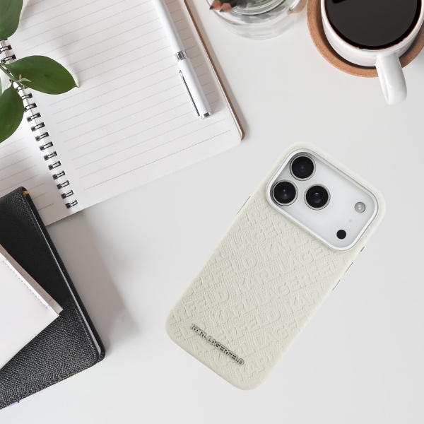 Powierzchnię etui pokrywa wytłaczany wzór z powtarzającym się napisem „Karl Lagerfeld”, a w dolnej części znajduje się eleganckie srebrne logo Karl Lagerfeld.
