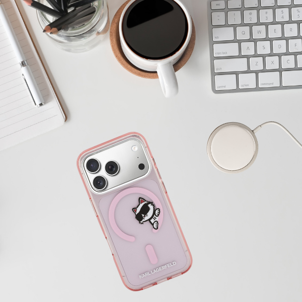 Tylną część zdobi wizerunek kotki Choupette, która wygląda zza pierścienia MagSafe.