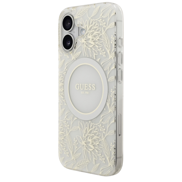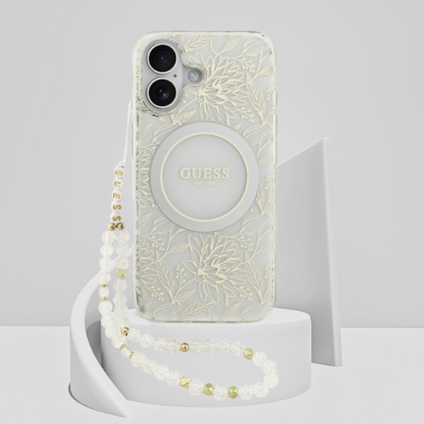 Etui Guess IML Flowers Electro Pearl Strap MagSafe do Apple iPhone 17 biały