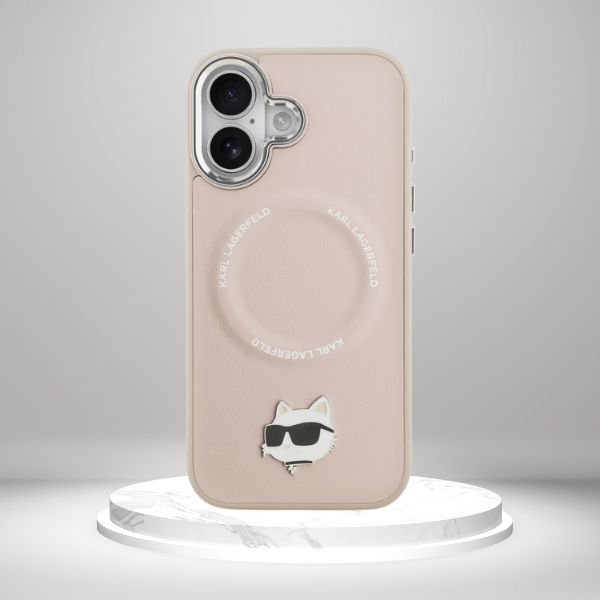 Plecki zdobi charakterystyczny metalowy pin Choupette, nadający akcesorium unikalnego, modowego charakteru. Całość dopełniają aluminiowa ramka aparatu oraz przyciski boczne w srebrnym kolorze, podkreślające luksusowy charakter produktu. Na pierścieniu MagSafe znajduje się napis „KARL LAGERFELD”, który dodaje elegancji i wyjątkowego stylu.