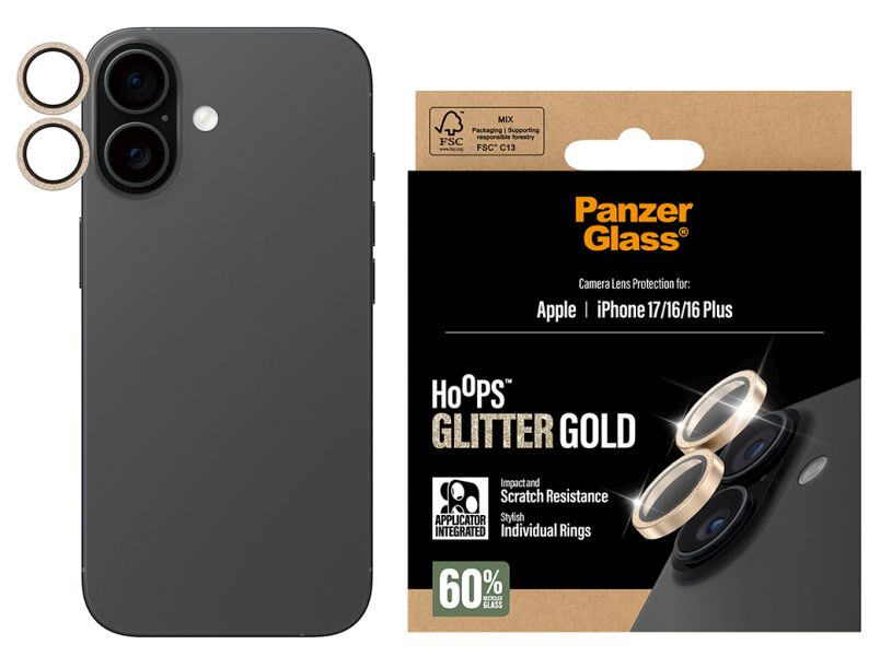 Szkło hartowane na obiektyw PanzerGlass Hoops Glitter do Apple iPhone 17 / 16 / 16 Plus złoty