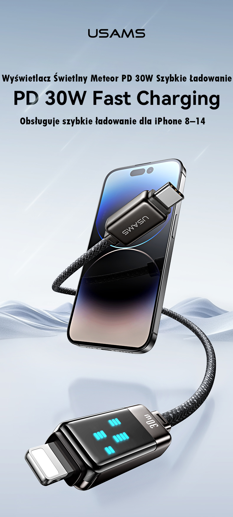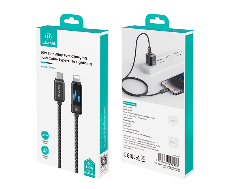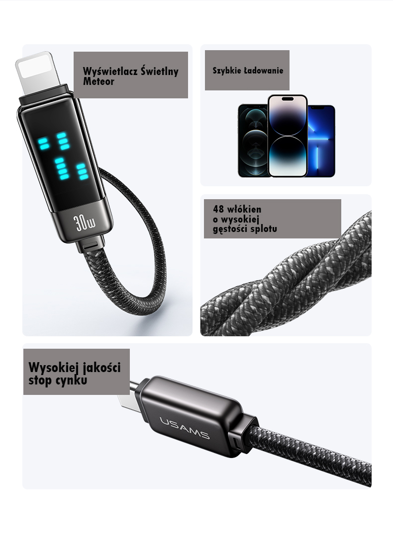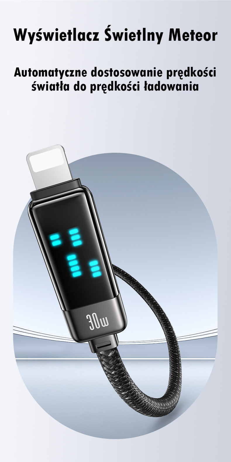 Kabel szybkiego ładowania i przesyłu danych 30W. Kabel w nylonowym oplocie charakteryzuje się wbudowanym wyświetlaczem LED METEOR. Posiada wtyczki typu USB-C/Lightning. Przewód ma wysoką odporność na zginanie. Prędkość przesyłu danych 480 Mbps. Obsługuje szybkie ładowanie dla iPhone 8–14.
