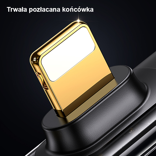 Przewód zakończony został złączem kątowym - to perfekcyjne rozwiązanie dla osób, które często korzystają z telefonu w trakcie ładowania. Zapomnij o złamanej końcówce kabla i niewygodnym, odstającym przewodzie! Dodatkowo pozłacana końcówka złącza jest gwarantem jego długotrwałej żywotności.