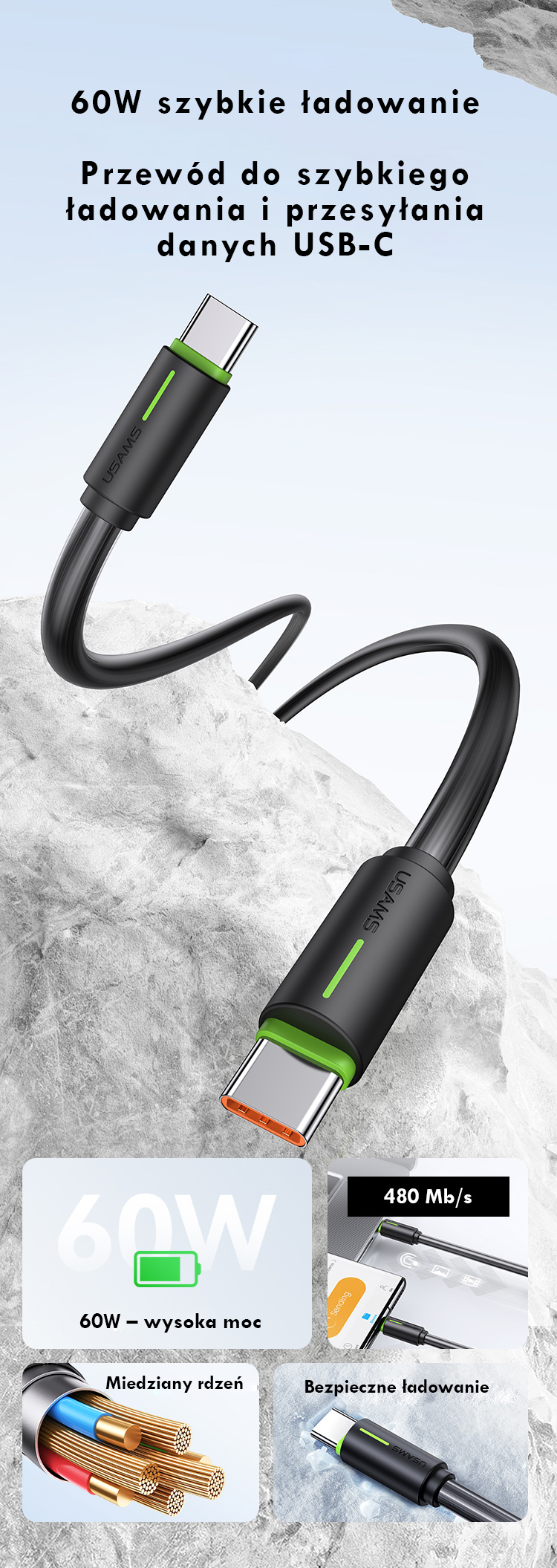 Oprócz szybkiego ładowania, USAMS SJ734 oferuje także transfer danych z prędkością do 480 Mbps, co umożliwia sprawną synchronizację plików, zdjęć czy wideo. Uniwersalna kompatybilność z urządzeniami wyposażonymi w port USB-C sprawia, że jest to wszechstronne i praktyczne akcesorium, które doskonale sprawdzi się zarówno w pracy, podróży, jak i w domu.