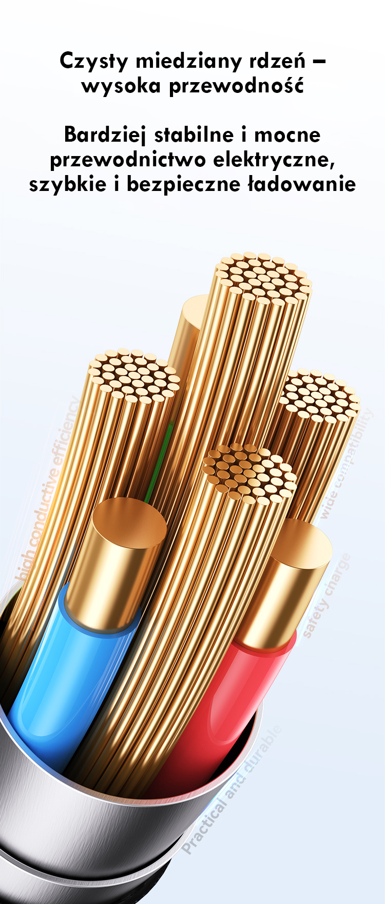 Dzięki przewodom z czystej miedzi o wysokiej przewodności oraz precyzyjnemu wykonaniu, kabel minimalizuje straty energii, zapewniając maksymalną efektywność ładowania. Solidna, 6-milimetrowa powłoka z wytrzymałego PVC chroni wnętrze przewodu przed uszkodzeniami mechanicznymi, przetarciami i zginaniem, co przekłada się na długą żywotność produktu. Nowoczesny, dwukolorowy design wyróżnia go spośród typowych przewodów, nadając mu elegancki i dynamiczny wygląd, który pasuje zarówno do biura, jak i codziennego użytkowania.