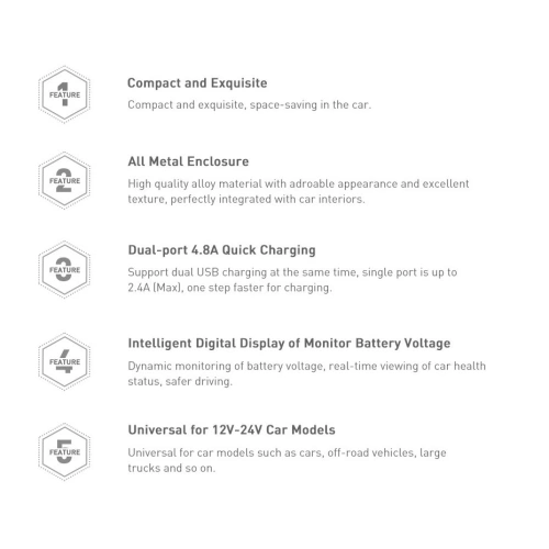 - Ładowanie pod kontrolą – Dzięki wyświetlaczowi napięcia ładowania, zawsze wiesz z jaką mocą odnawiana jest energia Twojego sprzętu. Ponadto akcesorium pokazuje również napięcie otrzymywane od akumulatora samochodowego, co może pomóc szybszym wykryciu problemu z nim. Nie trzeba też niczego przełączać. Wartość na ekranie przeskakuje automatycznie między trzema wspomnianymi kategoriami co 5 sekund.
