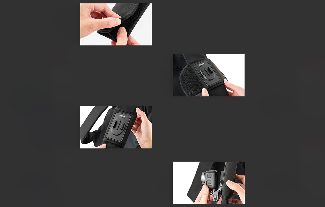 Uwolnij ręce i twórz oryginalne ujęcia, kiedy jedziesz na rowerze, zdobywasz górskie szczyty lub zjeżdżasz na nartach. Zapinany na rzep, antypoślizgowy pasek marki Telesin umożliwia stabilne przyczepienie kamery sportowej do plecaka. Wchodzące w skład zestawu mocowanie typu J-hook daje Ci mnóstwo możliwości zastosowania akcesorium.
