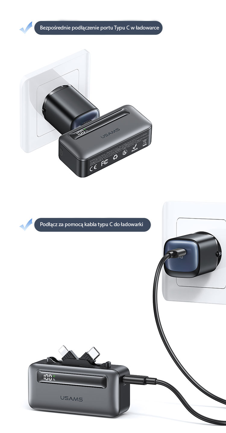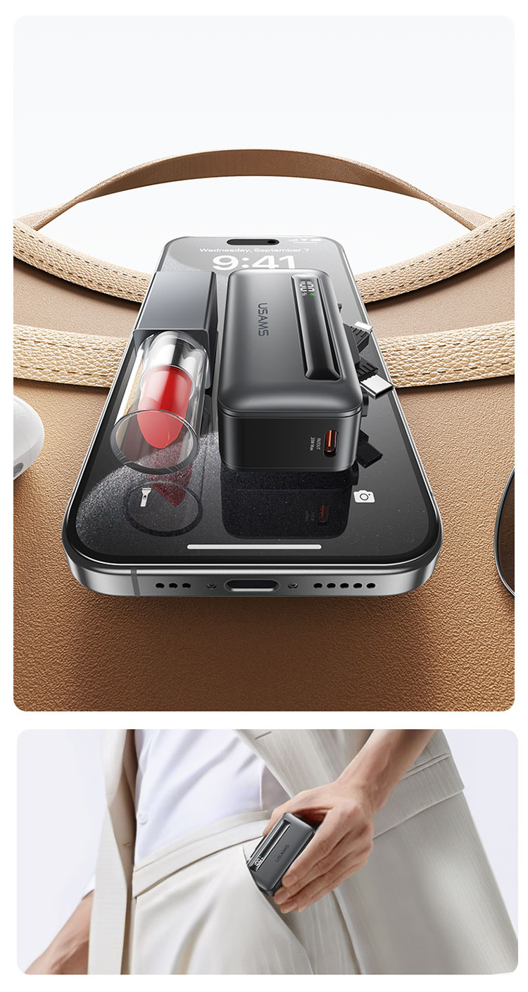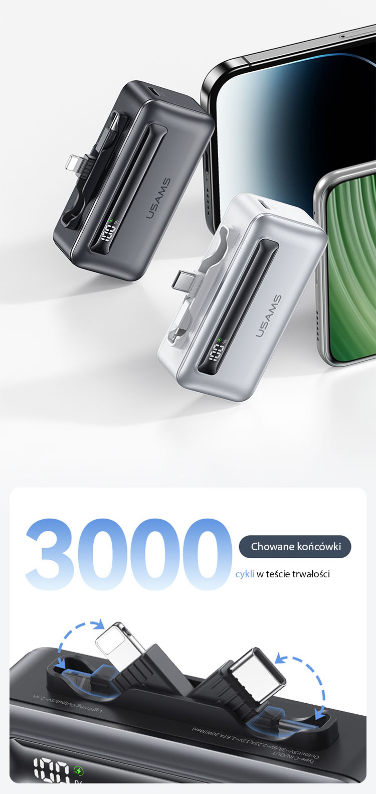 Ukryte podwójne porty zapewniają szybkie i wygodne ładowanie, eliminując potrzebę zabierania dodatkowych kabli podczas codziennych aktywności czy podróży. Składana wtyczka sprawia, że urządzenie jest łatwe do przechowywania i wygodne w przenoszeniu. Powerbank przeszedł test wytrzymałości na 3000 cykli, co świadczy o jego niezawodności i długotrwałej trwałości. Idealne połączenie funkcjonalności i nowoczesnego designu!
