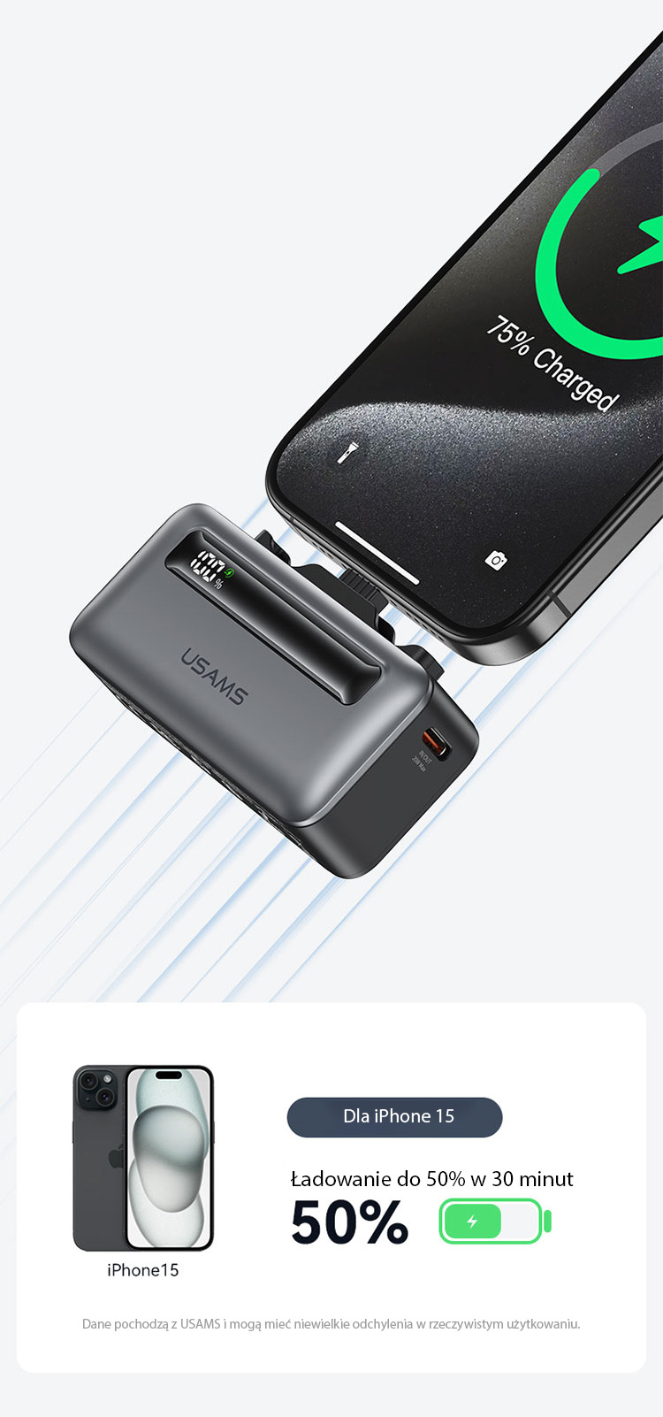 Dzięki nowoczesnej technologii, wystarczy tylko 30 minut, aby naładować iPhone 15 do 50% baterii. To rozwiązanie pozwala oszczędzać czas i zapewnia pewność, że Twoje urządzenia będą zawsze gotowe do działania. Idealne połączenie szybkości, wydajności i niezawodności, które sprawdzi się każdego dnia.