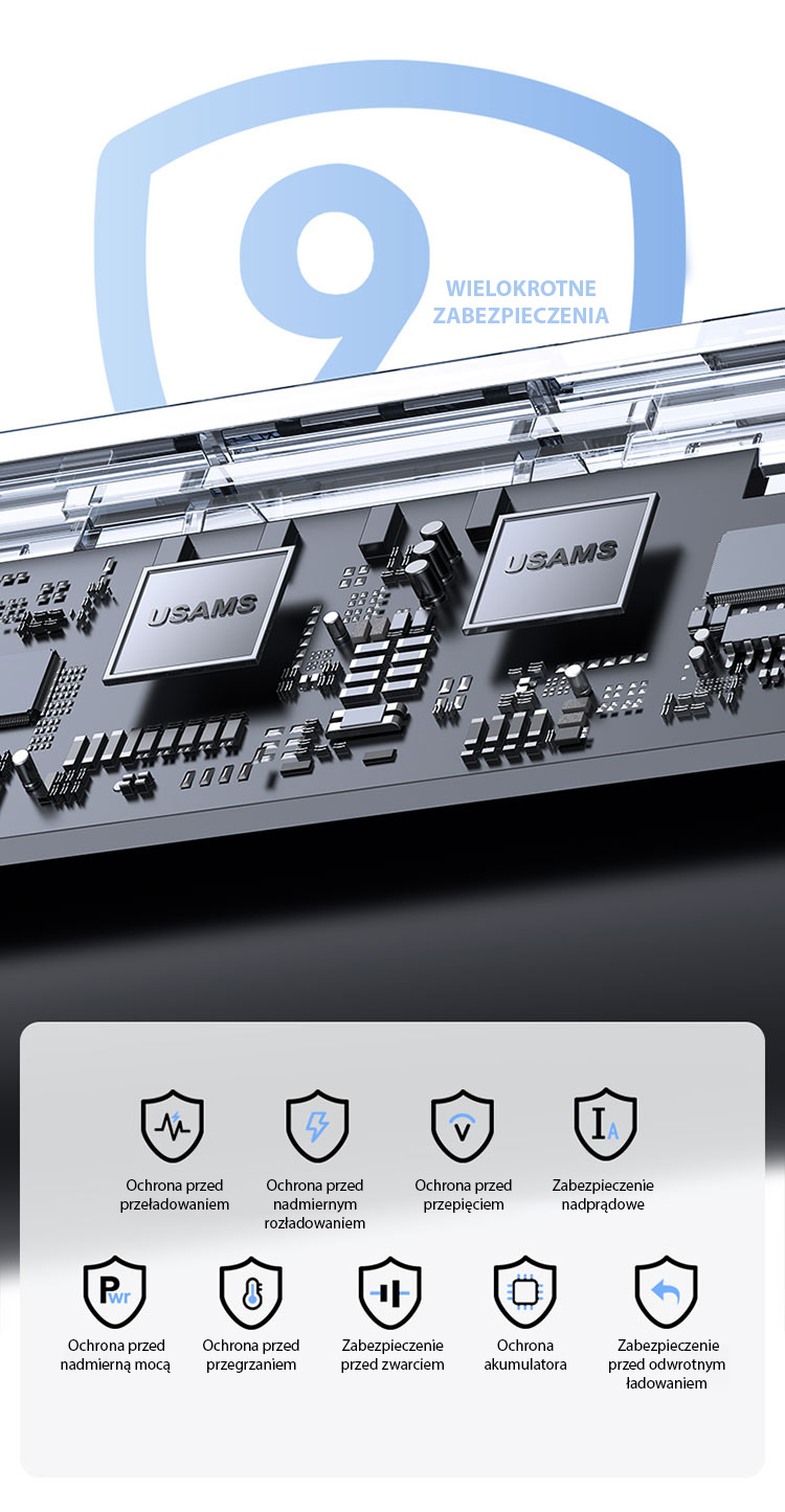 Wyposażony w wysokiej jakości chip, powerbank oferuje zaawansowany system ochrony, który dba o Twoje urządzenia podczas każdego ładowania. Funkcje takie jak ochrona przed przeładowaniem, nadmiernym rozładowaniem, przepięciem, przegrzaniem czy zwarciem zapewniają maksymalne bezpieczeństwo użytkowania. Dodatkowo, ochrona przed odwrotnym ładowaniem oraz zabezpieczenie baterii gwarantują niezawodność i długowieczność urządzenia.