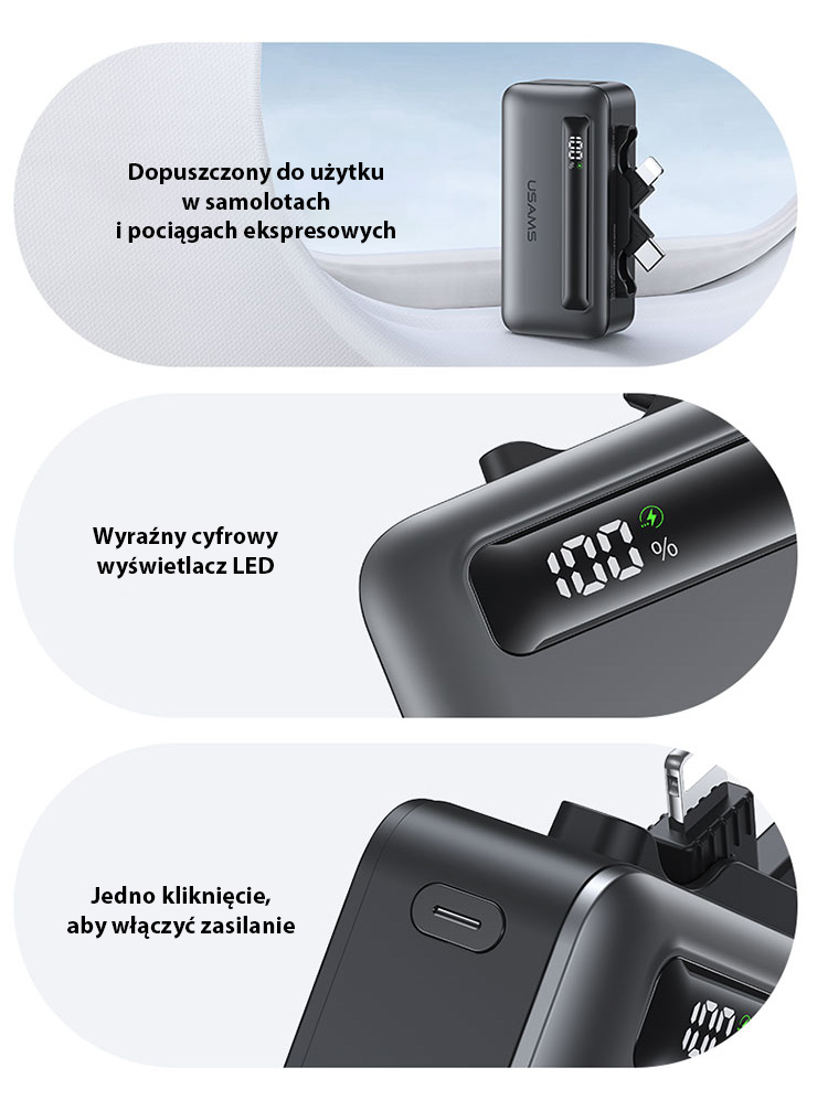 Powerbank został zaprojektowany z myślą o podróżnych – jest zgodny z wymaganiami dotyczącymi użytku w samolotach i pociągach ekspresowych. Wyraźny cyfrowy wyświetlacz LED pozwala łatwo monitorować poziom baterii, a funkcja jednym kliknięciem umożliwia szybkie i intuicyjne uruchomienie urządzenia.