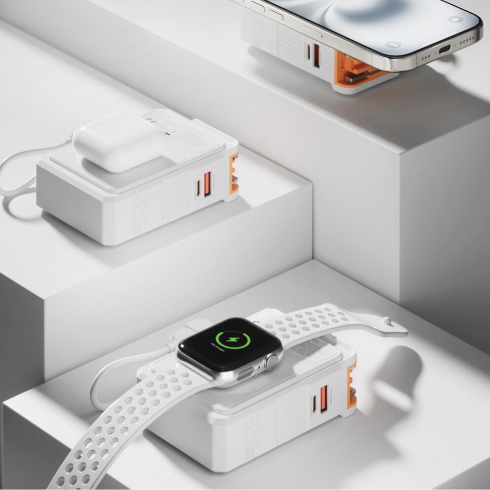 Dzięki powierzchni do ładowania bezprzewodowego zgodnej z technologią Qi, możesz zasilać urządzenia po prostu je kładąc. Kompatybilny z Apple Watch (Series 2–10, Ultra, SE), słuchawkami TWS i większością smartfonów, umożliwia wygodne, bezprzewodowe ładowanie bez potrzeby stosowania dodatkowych kabli. Sprawdzi się idealnie na biurku, w sypialni czy w podróży – eliminując potrzebę noszenia wielu ładowarek i przewodów.