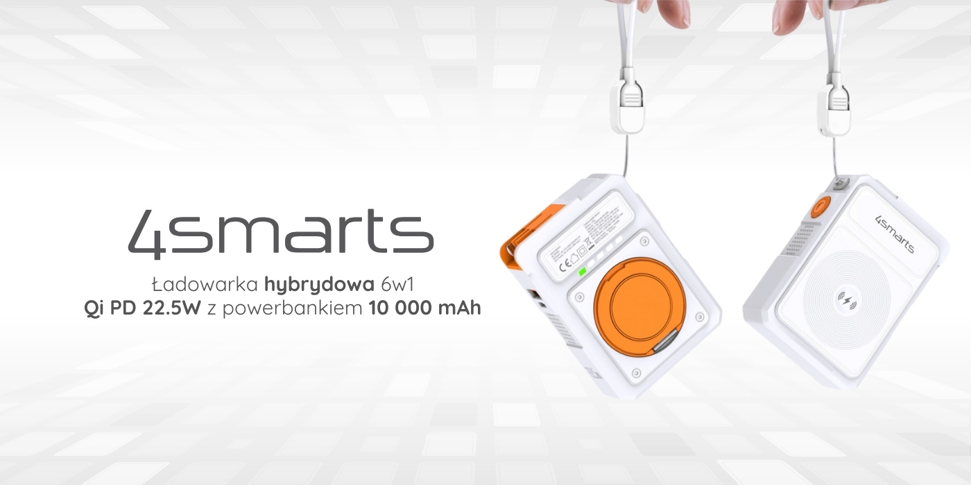 Ładowarka hybrydowa 4smarts 6w1 USB-C / USB-A PD 22.5W z powerbankiem 10000mAh, ładowanie indukcyjne Qi, kabel USB-C biała