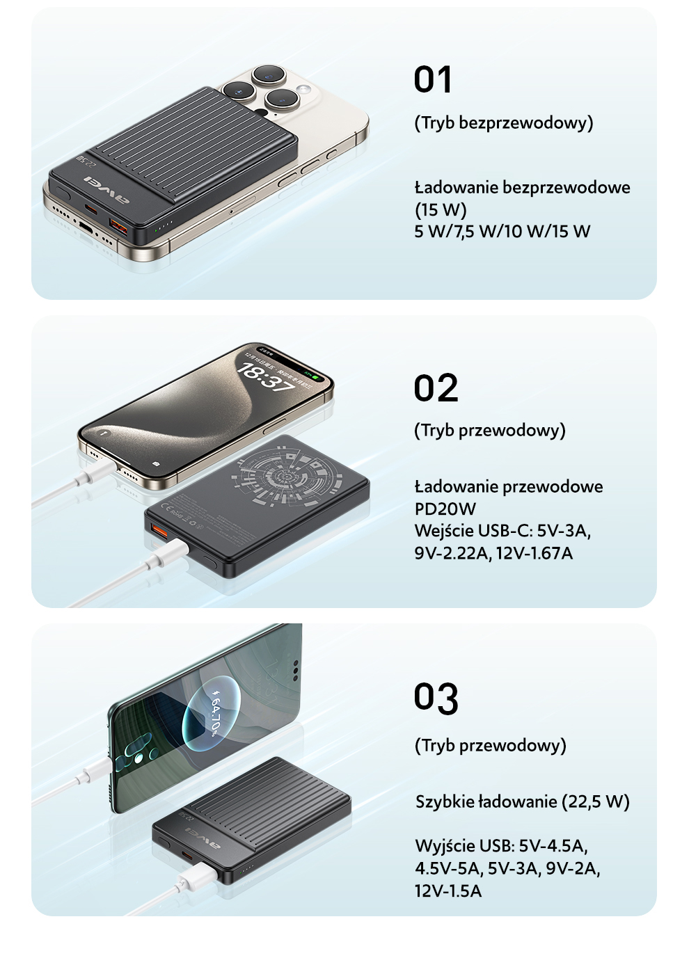| Wyjście USB | 5V/4,5A | 4,5V/5A | 5V/3A | 9V/2A | 12V/1,5A (22,5 W) |