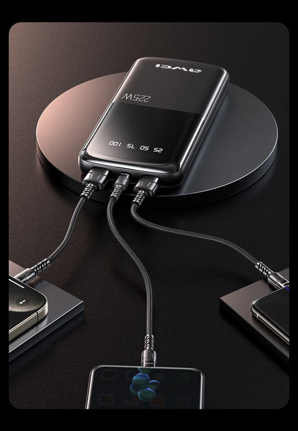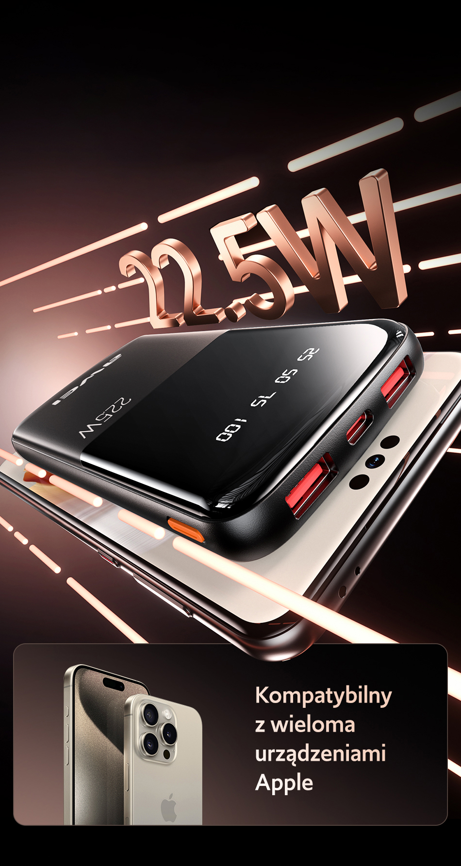 Ładuje w prędkości 22,5 W oraz PD20W, zapewniające odpowiednią moc i bezpieczeństwo ładowania. Moc PD20W jest kompatybilna z urządzeniami od Apple (iPhone 8-15, iPad).
