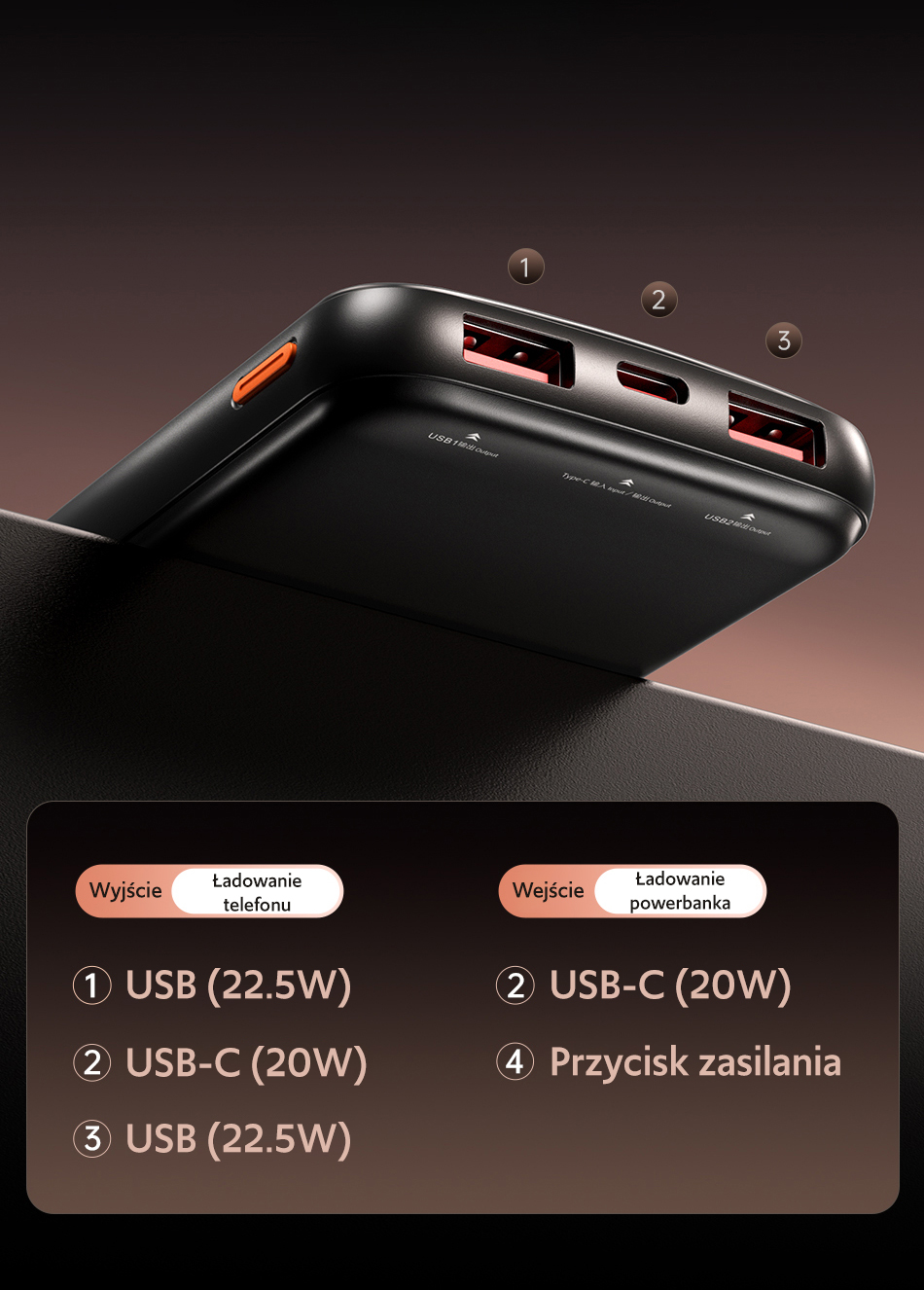 | Wyjście USB-C | 5V/3A | 9V/2A | 12V/1,5A |