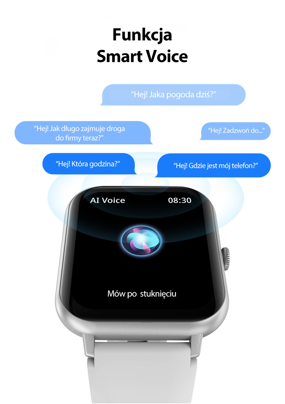 Funkcja Smart Voice to niezwykłe ułatwienie w codziennym życiu. Wystarczy, że stukniesz w ekran i zaczniesz mówić, a Twój inteligentny zegarek, wykona polecenia, o które go prosisz! Chcesz wiedzieć ile aktualnie zajmie Ci droga do pracy albo gdzie aktualnie znajduje się Twój telefon – nie ma najmniejszego problemu!