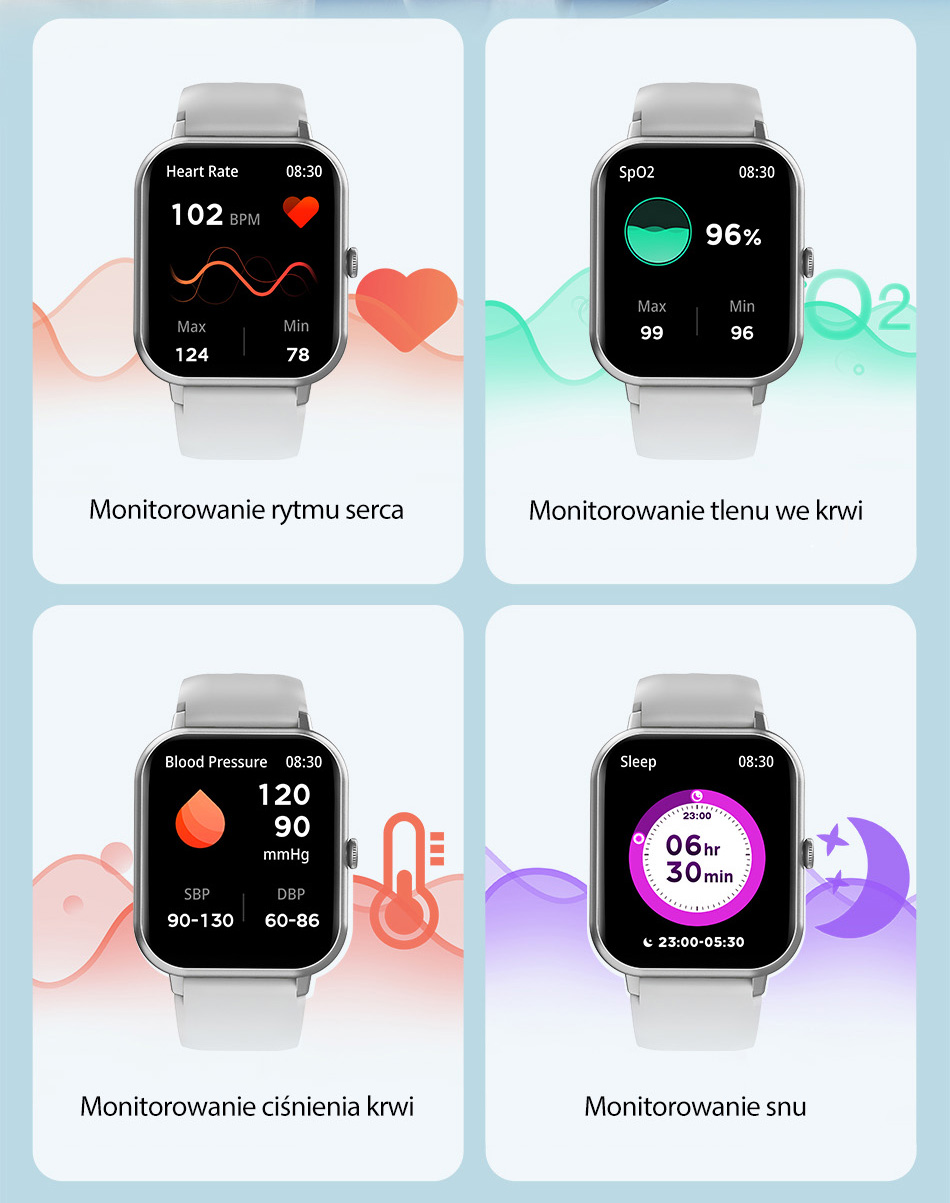SmartWatch zapewnia ciągły monitoring przez cały dzień, śledząc Twoje parametry zdrowotne, abyś mógł być świadomy swojego stanu zdrowia w każdej chwili. Dzięki tej funkcji, SmartWatch automatycznie rejestruje zmiany m.in. w Twoim tętnie czy poziomie snu.