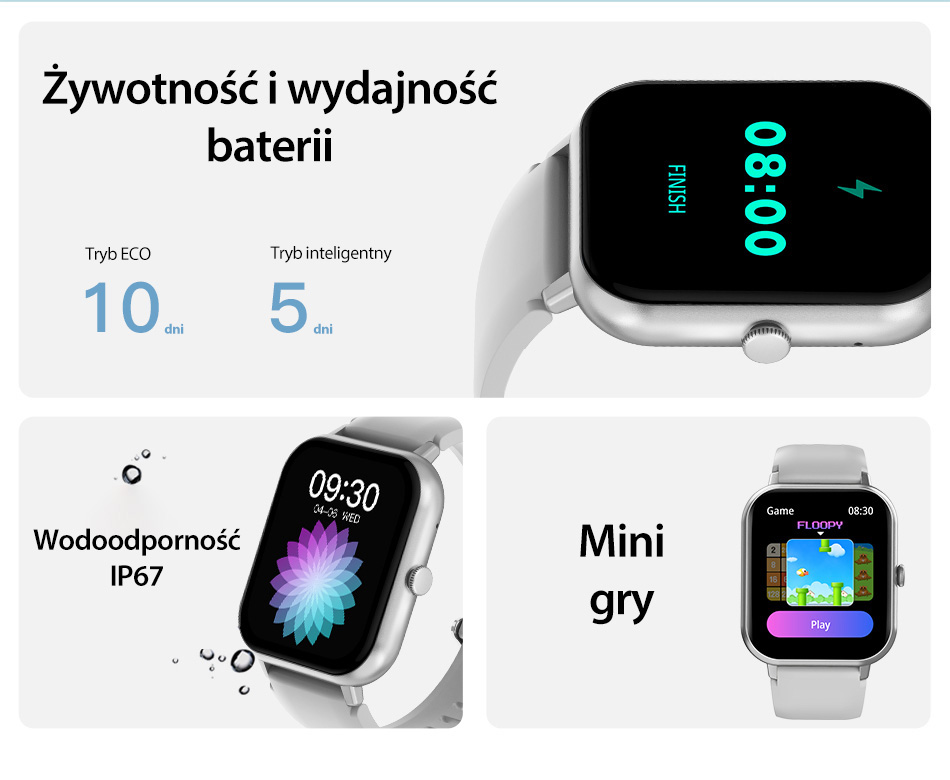 SmartWatch cechuje się świetną wydajnością baterii, ponieważ zależności od trybu, w którym jest używany, bateria wytrzyma od 5 do 10 dni. Dodatkowo klasa szczelności IP67 pozwala na korzystanie z zegarka w pełni, nawet podczas intensywnego treningu czy deszczowej pogody. Natomiast dzięki doskonałej rozdzielczości wyświetlacza, masz możliwość przerwać monotonność dnia grając w mini gry, gdziekolwiek jesteś!
