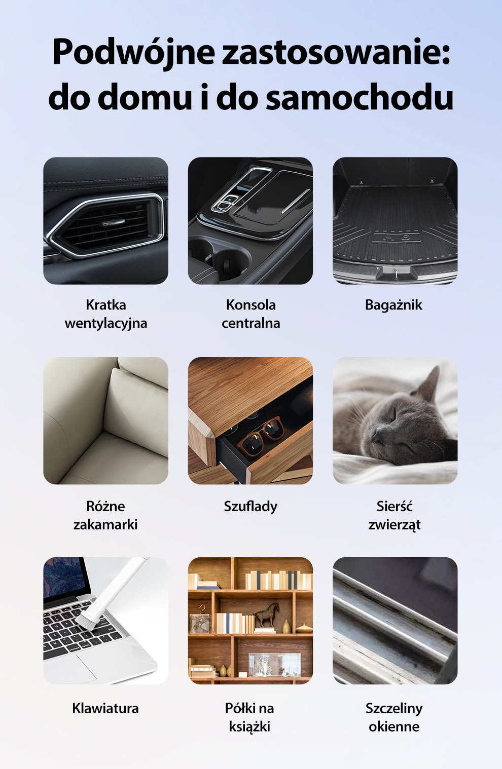Ten mini odkurzacz bezprzewodowy jest idealny do czyszczenia zarówno domu, jak i samochodu, dzięki swojej wszechstronności i praktycznemu designowi.