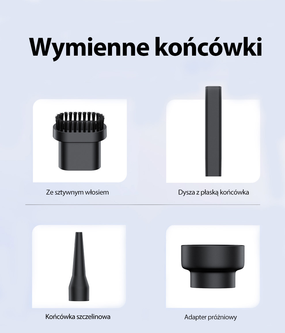 Urządzenie wyposażone jest w zestaw wymiennych końcówek, które zapewniają skuteczność w czyszczeniu różnorodnych powierzchni. Dzięki możliwości wymiany końcówek łatwo dostosujesz odkurzacz do swoich potrzeb.