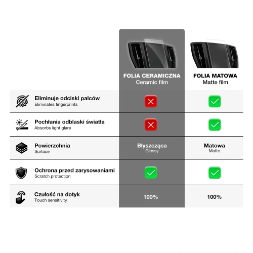 Folia ceramiczna nie pochłania odcisków palców. Jest wykonana z materiału o wysokiej twardości, który zapewnia skuteczną ochronę przed zarysowaniami. Wyświetlacz Twojego samochodu będzie chroniony przed uszkodzeniami spowodowanymi przez klucze, monety czy inne ostre przedmioty.