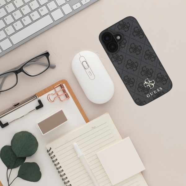 W dolnej części etui znajdują się logo Guess oraz złota naszywka 4G, które subtelnie podkreślają prestiż tego etui.