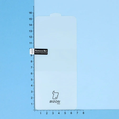 - Podnieś i delikatnie zegnij krótszą, dolną część matowej podkładki z napisem Bizon tak, aby odkleiła się od folii i za pomocą karty jednym, płynnym ruchem, przejedź w stronę dolnej krawędzi ekranu tak, by folia odpowiednio się przykleiła.