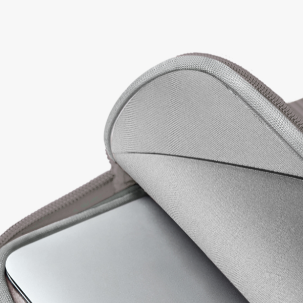 Trójwarstwowa ochrona i miękkie pluszowe wnętrze amortyzuje urządzenie, a wewnętrzny ochraniacz przed wstrząsami oraz solidne, płaskie szwy typu flatlock zwiększają bezpieczeństwo. Dodatkowo suwak ze stopu cynku nadaje całości nowoczesnego, minimalistycznego charakteru i zapewnia solidne zamknięcie.