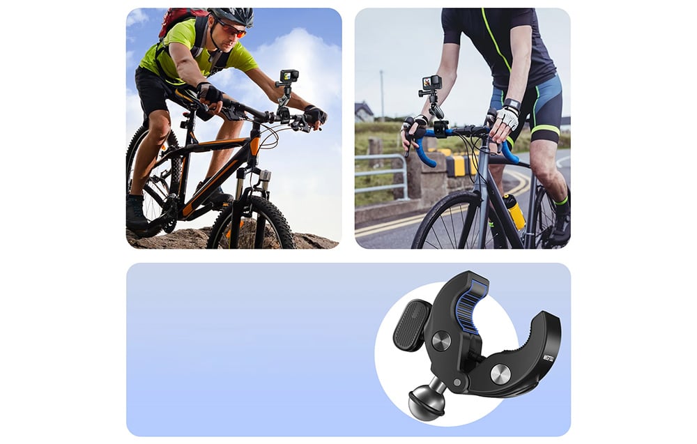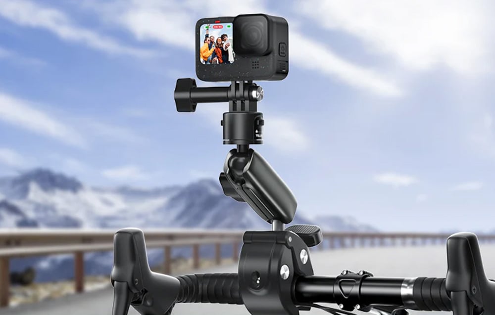 Innowacyjna konstrukcja mocowania inspirowana szczypcami kraba zapewnia łatwość montażu i demontażu, co znacząco ułatwia korzystanie z akcesorium. Mocowanie wyposażone jest w miękką, odporną na zużycie gumę wewnątrz pierścienia, co zwiększa siłę zacisku i zapobiega przesuwaniu się kamery podczas jazdy. Ta konstrukcja sprawia, że mocowanie jest nie tylko funkcjonalne, ale także wyjątkowo trwałe i odporne na codzienne użytkowanie w trudnych warunkach terenowych.