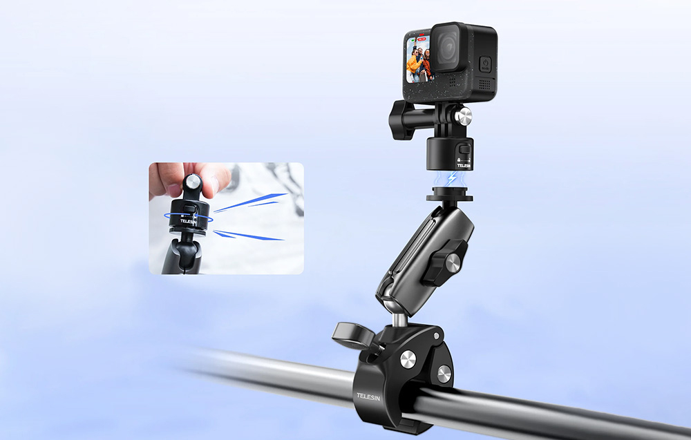 Mocowanie Telesin wykorzystuje zaawansowany system szybkozłączny, który umożliwia szybkie i łatwe przełączanie pomiędzy różnymi akcesoriami ekologicznymi. W ten sposób użytkownicy mogą błyskawicznie dostosować konfigurację kamery do swoich potrzeb, bez konieczności skomplikowanego montażu. Wyraźny dźwięk klikania podczas montażu oraz wyraźne sprzężenie zwrotne umożliwiają łatwą i intuicyjną obsługę nawet bez potrzeby patrzenia na uchwyt, co jest szczególnie przydatne podczas dynamicznych sytuacji.