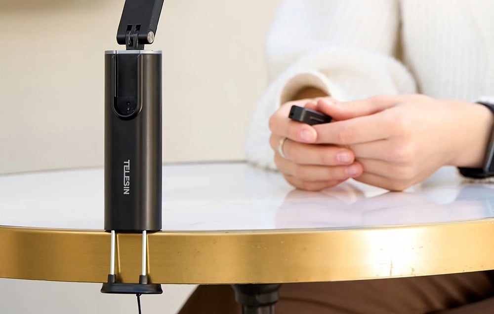 Dwa obrotowe przeguby pozwalają na regulację w zakresie 360°, dzięki czemu z powodzeniem ustawisz telefon pod dowolnym kątem, aby wygodnie oglądać filmy lub nagrywać materiały. Pilot Bluetooth pozwala sterować telefonem z odległości do 10 metrów. Możesz zdalnie robić zdjęcia, nagrywać filmy oraz przewijać treści w aplikacjach. Po zakończeniu użycia z łaywością wsuniesz go z powrotem w obudowę.